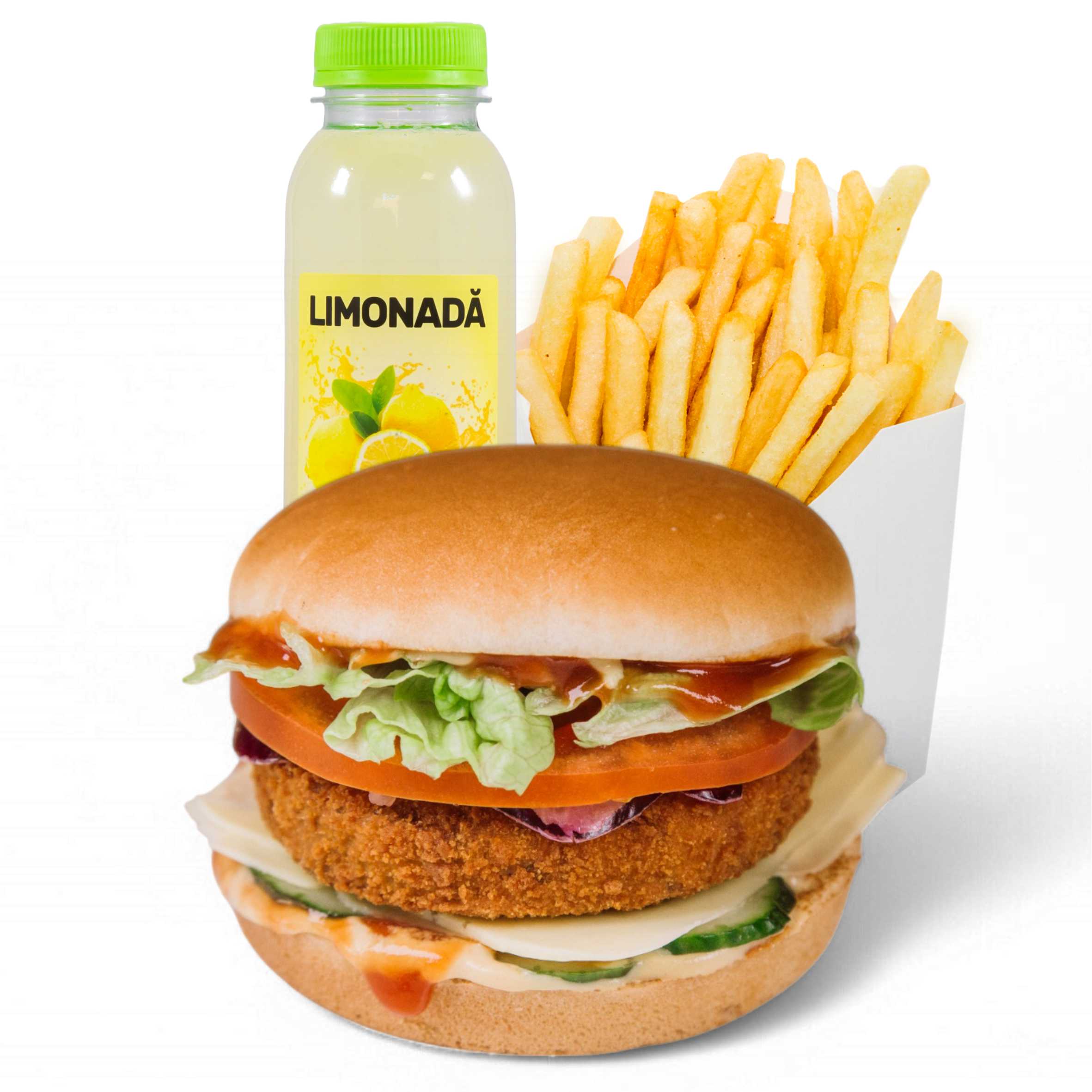 470 g Ingrediente: Vegi Mo’s Burger 250 g + cartofi prajiti 120 g + băutură răcoritoare