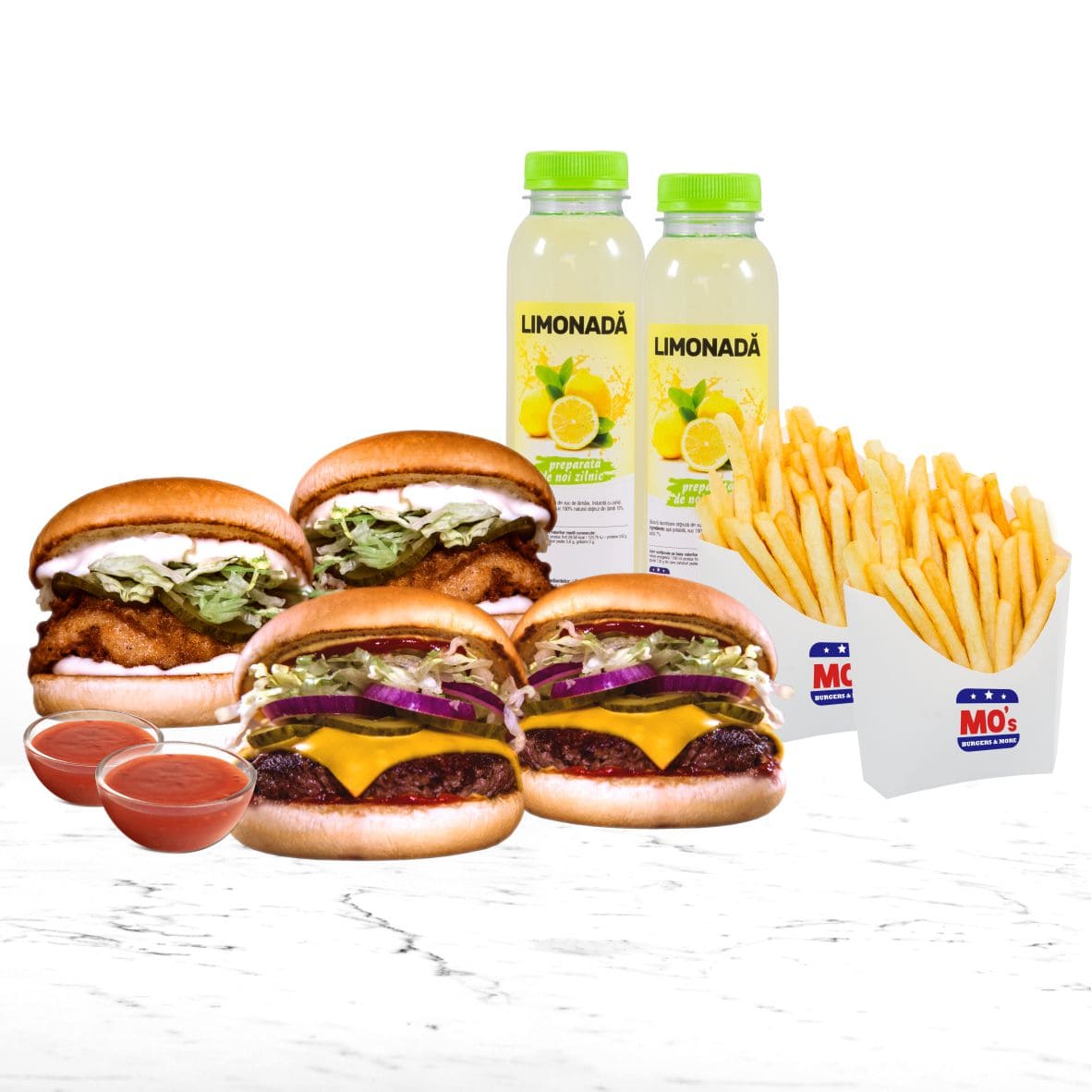 Ingrediente: 2 burgeri Classic One Chicken 280 g + 2 burgeri Classic One Beef 360 g + 2 portii de cartofi prajiti 240 g + 2 sosuri la alegere 50 g – 80 g + 2 băuturi răcoritoare la alegere